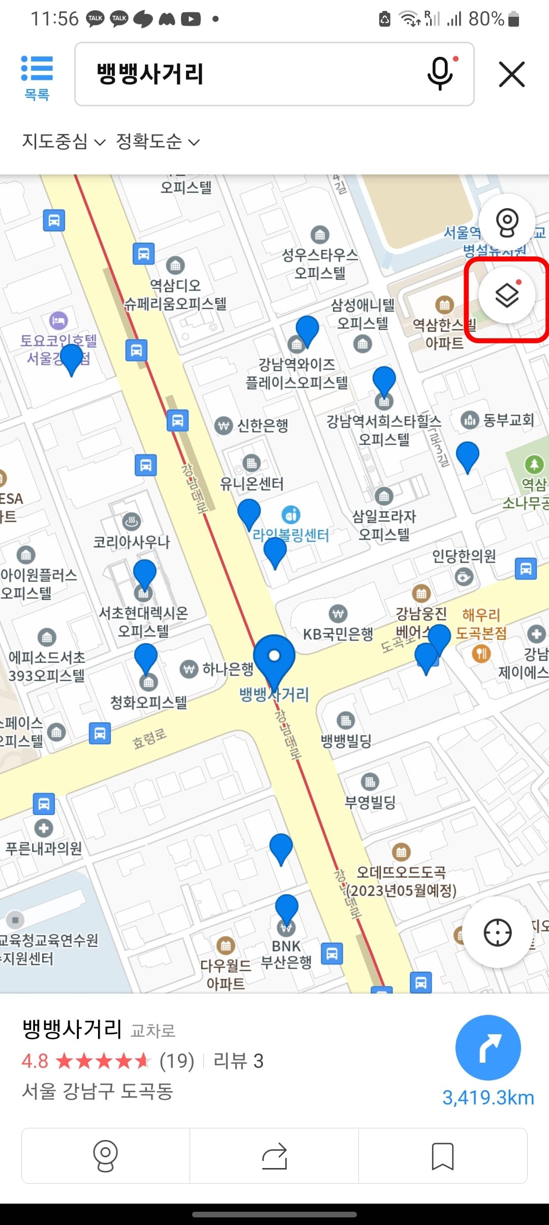 모바일에서 다음지도 스카이뷰를 사용하려면 먼저 카카오맵 어플이 설치되어 있어야 합니다. 어플을 설치한 후 실행하시면 위와 같은 화면을 볼 수 있습니다. 검색창에 원하는 목적지를 입력하고 검색합니다. 여기에서도 ‘뱅뱅사거리’를 스카이뷰로 보도록 하겠습니다.