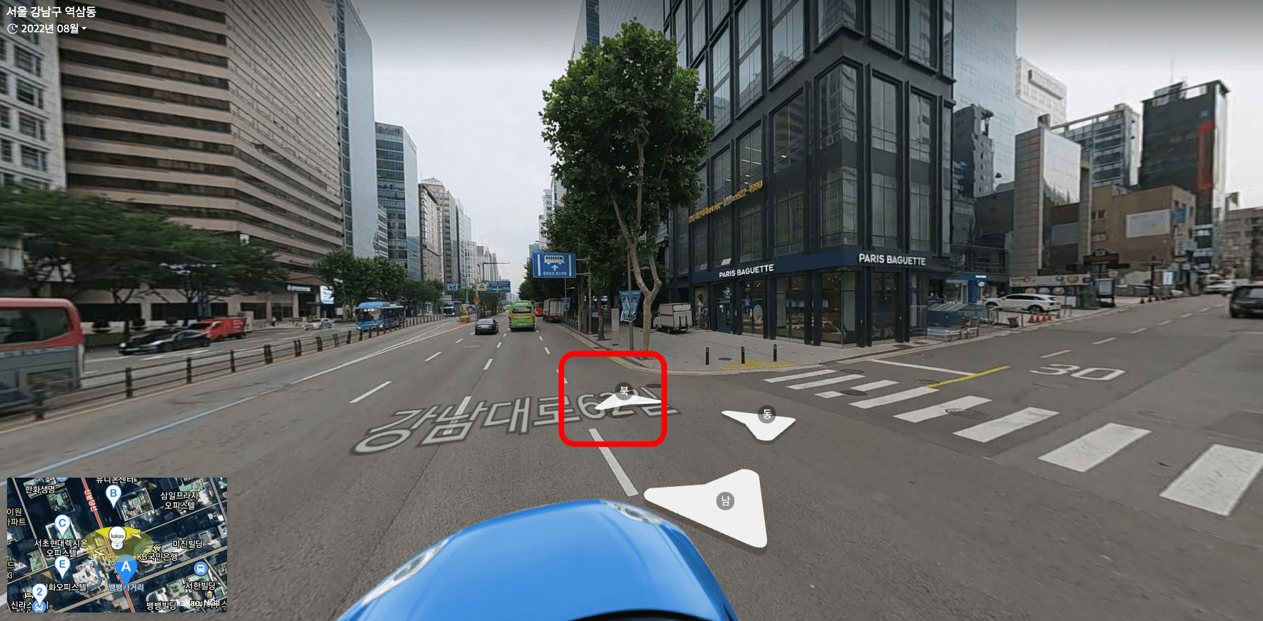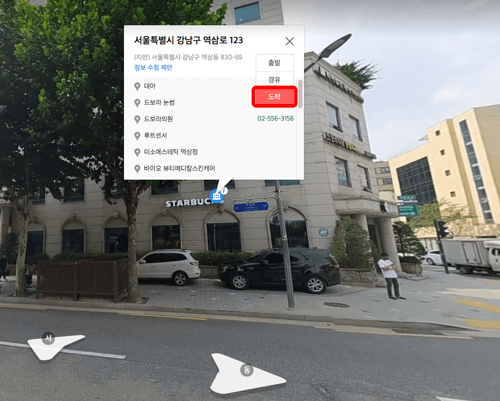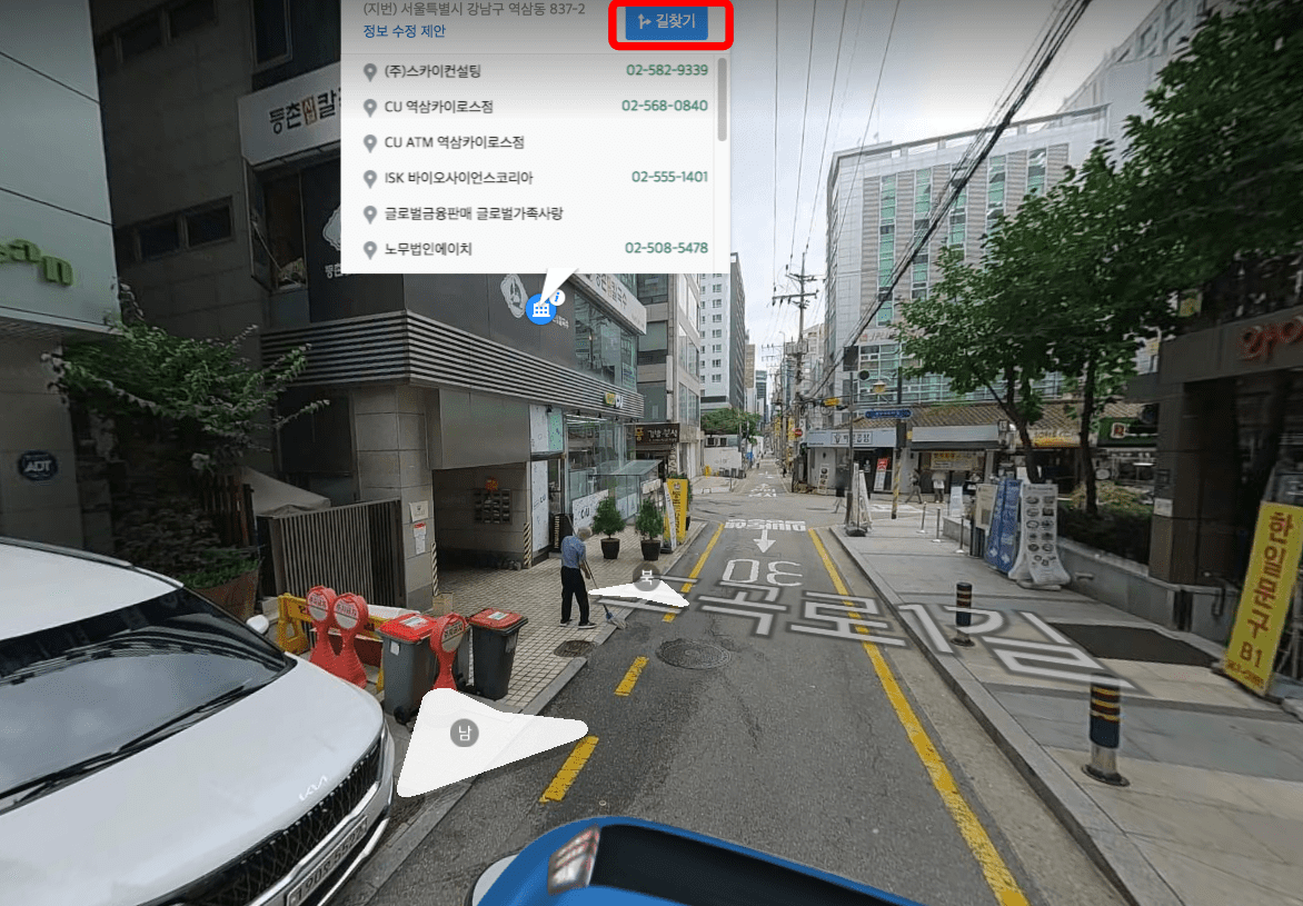로드뷰가 표시되면 뱅뱅사거리의 모습이 현실감 있게 보여집니다. 진행하고자 하는 방향의 화살표를 누르면 이동이 가능합니다. 찾고자 하는 건물에 마우스를 잠시 멈추면 건물 정보에 대한 아이콘이 표시됩니다.