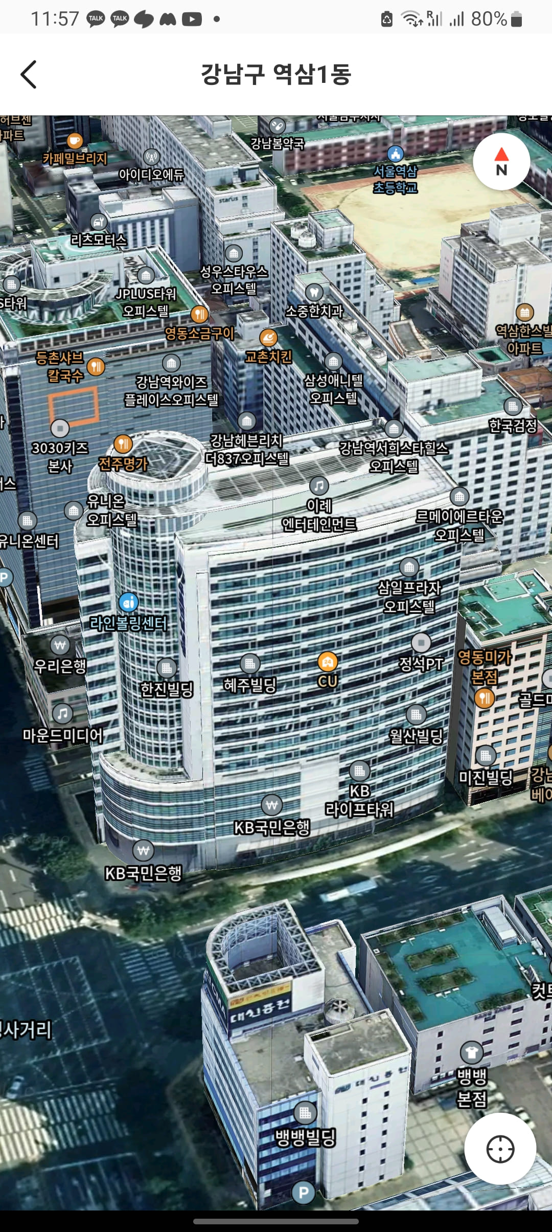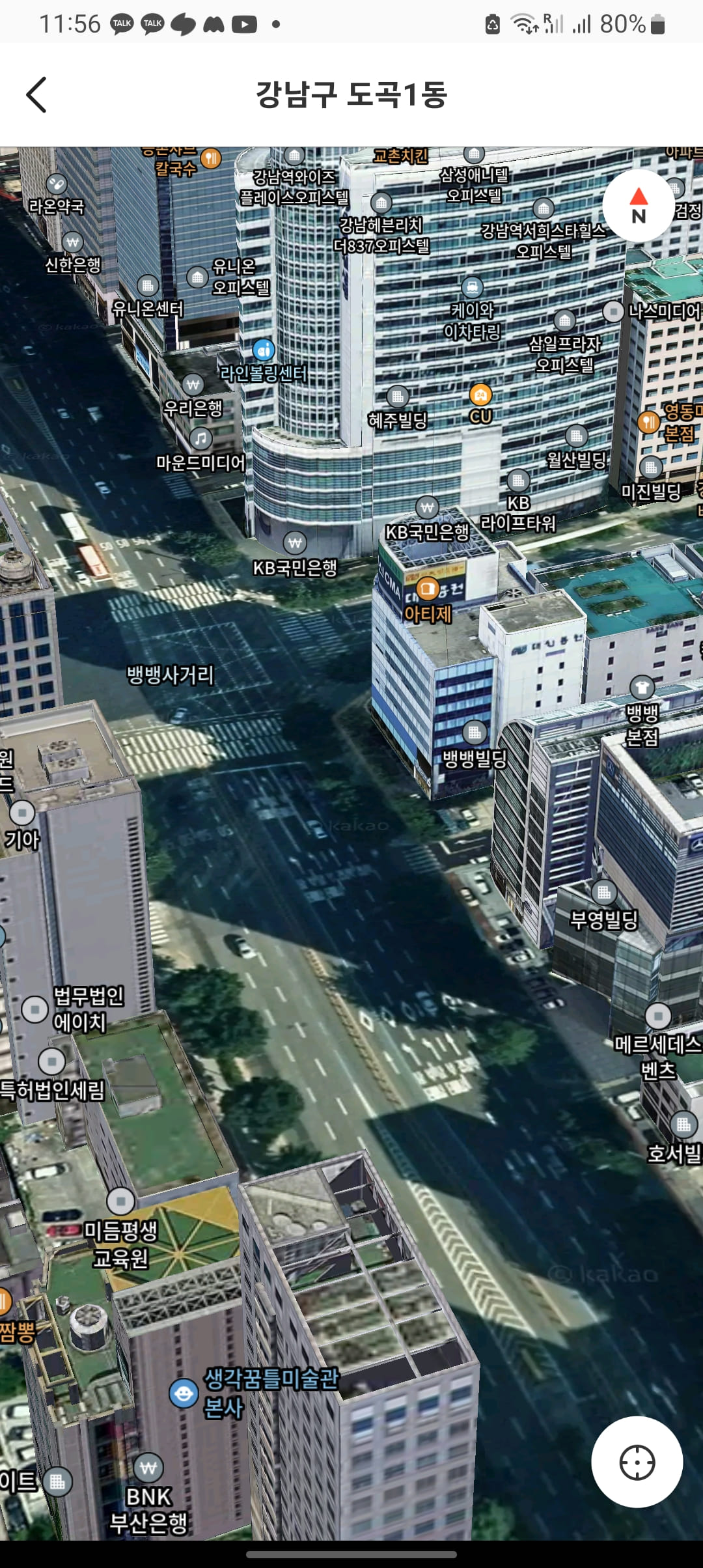 모바일에서 사용가능한 3D스카이뷰를 선택하면 더 현실감 있는 뱅뱅사거리의 모습을 입체로 확인할 수 있습니다. 화면을 드래그하여 확대하면 좀 더 자세한 사거리의 모습이 보입니다. 건물에 입주한 업체까지 자세한 정보를 얻을 수 있습니다.
