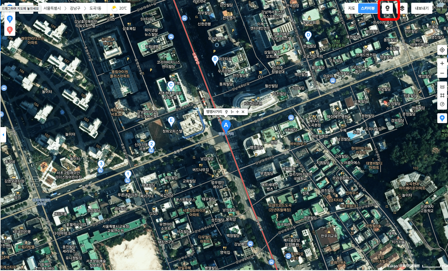 카카오맵에 방문하면 다음과 같은 화면을 볼 수 있습니다. 지도 우측상단에서 ‘스카이뷰’ 메뉴를 선택한 후 좌측 검색란에 방문할 위치를 검색합니다. 여기에서는 강남 뱅뱅사거리를 검색해 보았습니다. 지도를 확대하고 싶으시다면 우측 + 아이콘을 클릭하여 확대할 수 있습니다.