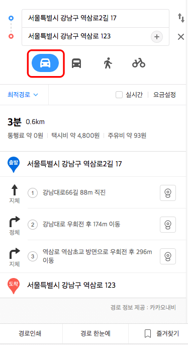 길 찾기는 우측 지도 화면에서 확인할 수 있으며 좌측에서는 자동차, 버스, 도보, 자전거를 이용한 내비게이션과 예상소유시간, 택시비, 주유비 등이 표시되는 것을 확인할 수 있습니다.