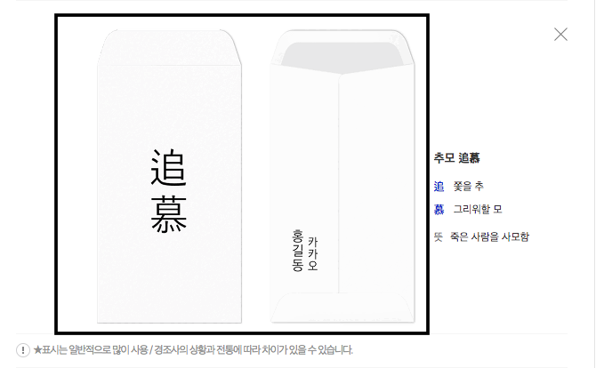 위의 뜻을 살펴보면 의미가 거의 비슷하기 때문에 흰색 봉투 앞면에 적절한 한자를 적어 넣고 봉투 뒷면에 왼쪽 편에 이름과 소속을 세로로 적는 것이 가장 일반적인 방법입니다. 만약 딱히 소속이 없다면 이름만 세로로 적어 넣으시면 됩니다.