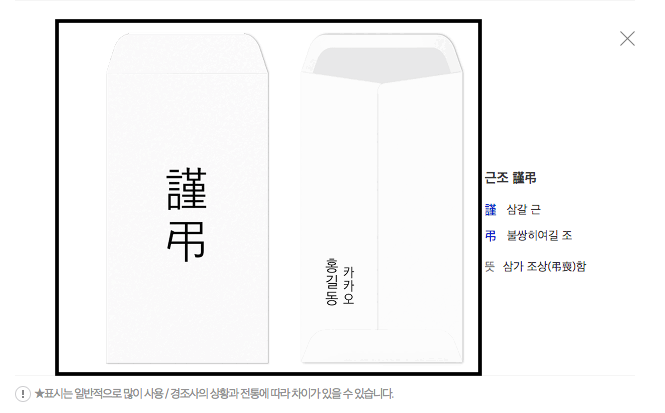 - 근조 謹弔 : 사람의 죽음에 대해 삼가 슬픈 마음을 나타냄