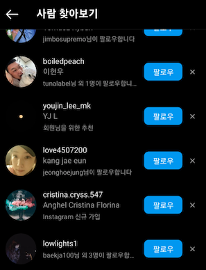 사람 찾아보기에서는 다양한 사람들이 확인되는 것을 볼 수 있습니다. 여기에 표시되는 추천인들은 자신의 지인이나 그들의 지인, 그리고 나의 팔로워와 연결되어 있는 사람들이 나타날 수 있으므로 리스트에서 사진과 이름, 그리고 프로필을 확인해서 사람찾기를 활용해 볼 수 있습니다.