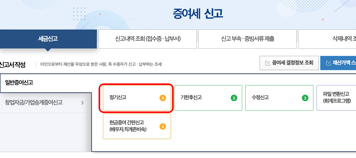 신고/납부 > 세금신고 > 증여세를 클릭합니다. 증여세 신고 화면이 표시되면 정기신고를 클릭합니다.