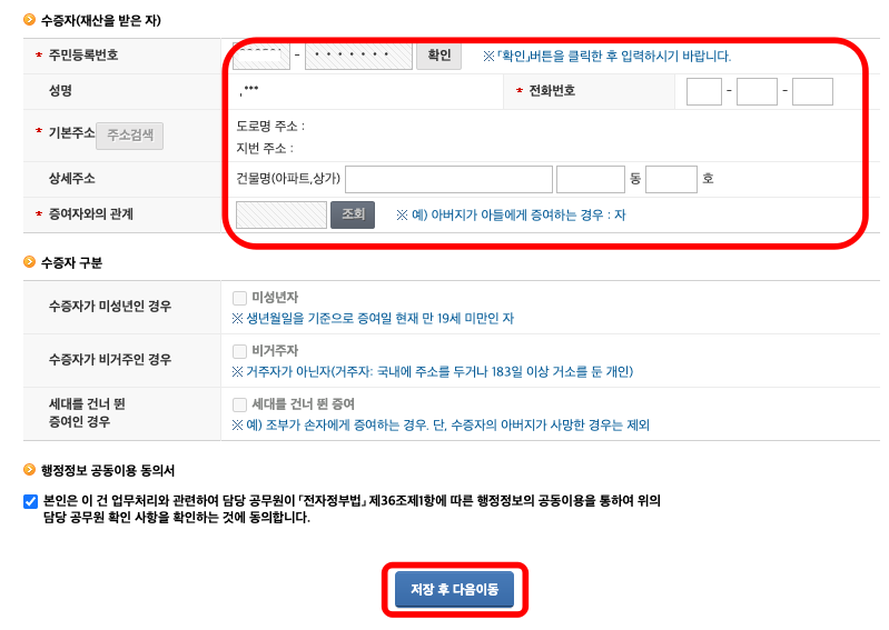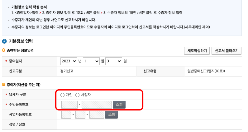 기본정보 입력란이 표시되면 증여일자를 입력하고 증여자 정보 입력후 ‘조회’ 버튼을 클릭합니다. 수증자 정보의 확인 버튼을 클릭하신후 수증자 정보를 입력합니다.
