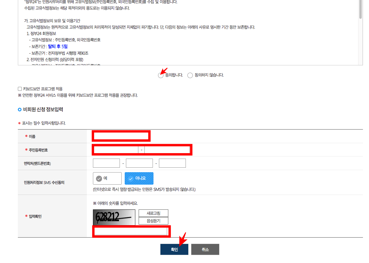 회원, 비회원 신청하기 하면이 표시되면 비회원 신청하기를 선택합니다. 개인정보 및 고유식별정보 수집에 대한 동의 표시를 하고 하단에서 이름, 주민등록번호, 입력확인 숫자를 입력한 후 하단의 확인 버튼을 클릭합니다.