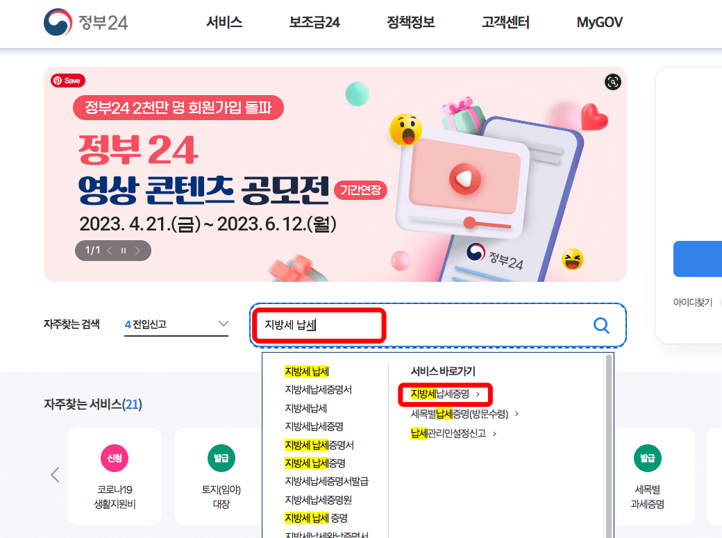 정부 24 홈페이지에 도착하시면 위와 같은 화면을 확인할 수 있습니다. 검색창에 ‘지방세 납세’를 검색하여