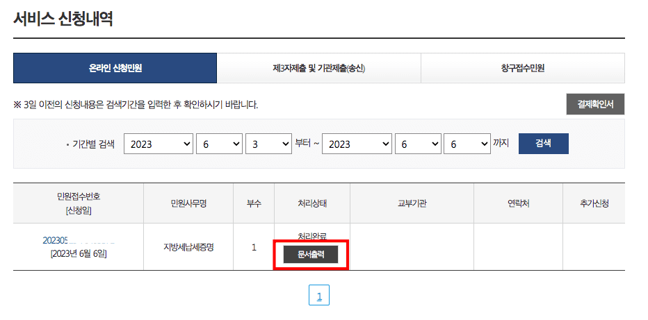 서비스 신청내역에 지방세납세증명 처리가 완료된 것을 확인할 수 있습니다. 문서출력 버튼을 클릭합니다. 증명서가 화면에 표시되면 우측 상단의 인쇄버튼을 클릭하여 출력을 완료합니다.