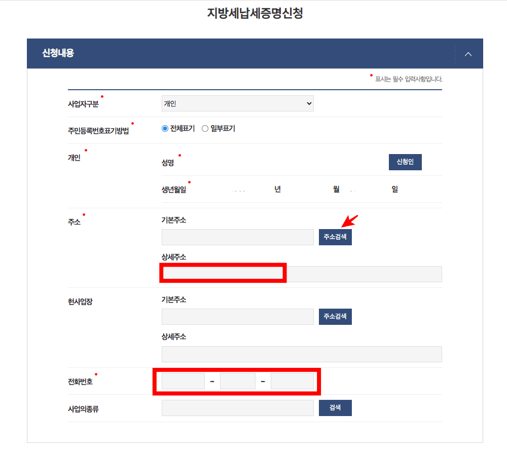 지방세납세증명신청 페이지가 표시되면 신청내용에서 주소검색을 클릭하여 주소 입력 후 하단에 상세주소를 입력합니다. 이후 전화번호를 입력합니다. 신청내용에 증명서 사용목적을 선택하시고 하단의 민원신청하기 버튼을 클릭합니다.