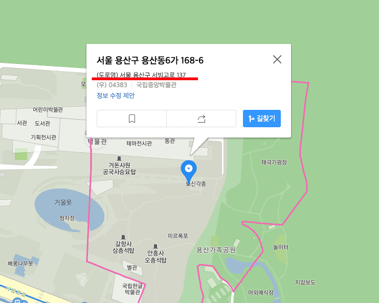 카카오맵이 열리면 하단에서 주소를 클릭합니다. 우측 지도 화면에서 도로명 주소인 ‘서울 용산구 서빙고로 137’과 우편번호를 확인할 수 있습니다.