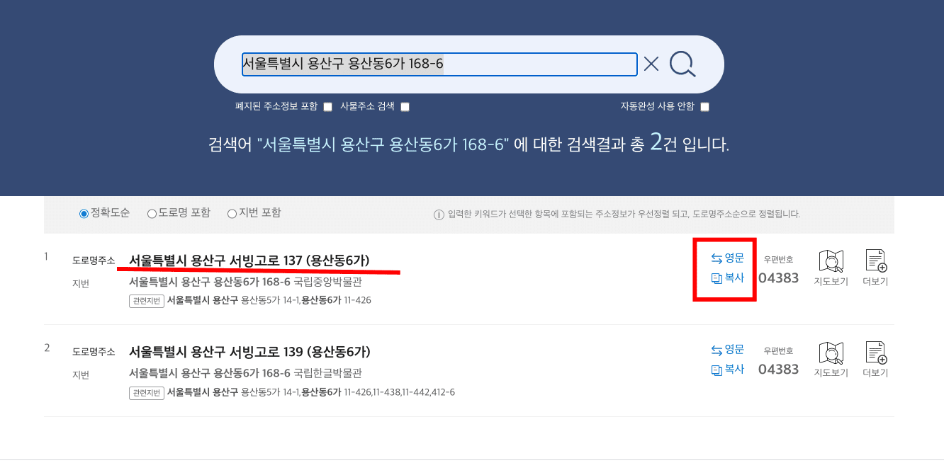 검색결과를 살펴보시면 지번 주소 위에 ‘서울특별시 용산구 서빙고로 137’ 도로명주소가 표시되는 것을 확인할 수 있습니다. 만약 영문 주소를 원하신다면 우측의 영문 복사 버튼을 클릭하시고 붙여 넣기 하시면 됩니다.