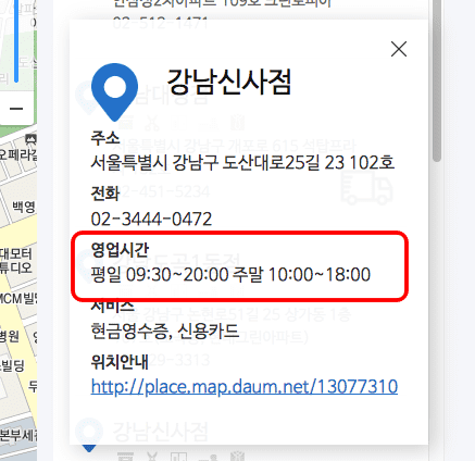 크린토피아 강남신사점의 영업시간과 전화번호, 주소 등이 자세히 표시되는 것을 확인할 수 있습니다.
