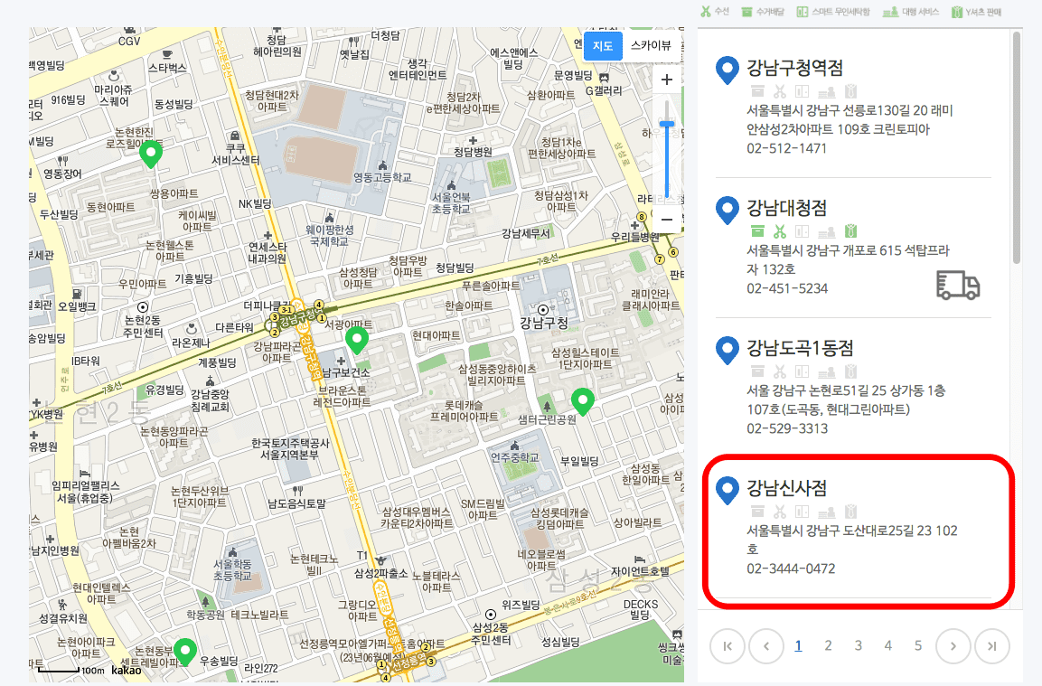 매장찾기 메뉴가 표시되면 원하시는 지역을 검색창에 입력하고 검색합니다. 여기에서는 강남구를 검색해 보도록 하겠습니다. 저는 회사가 가까운 강남신사점 크린토피아의 영업시간을 확인해 보겠습니다. 강남신사점 아래의 주소 부분을 클릭합니다.