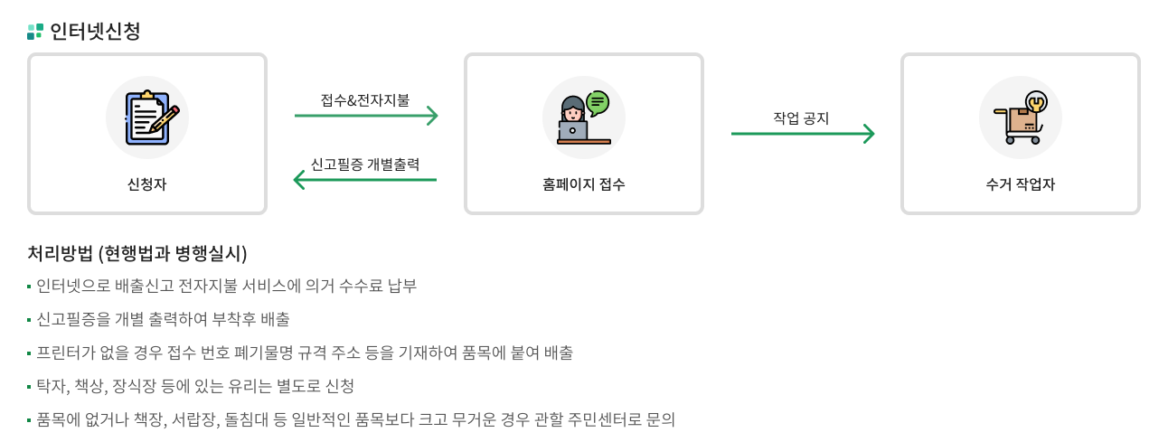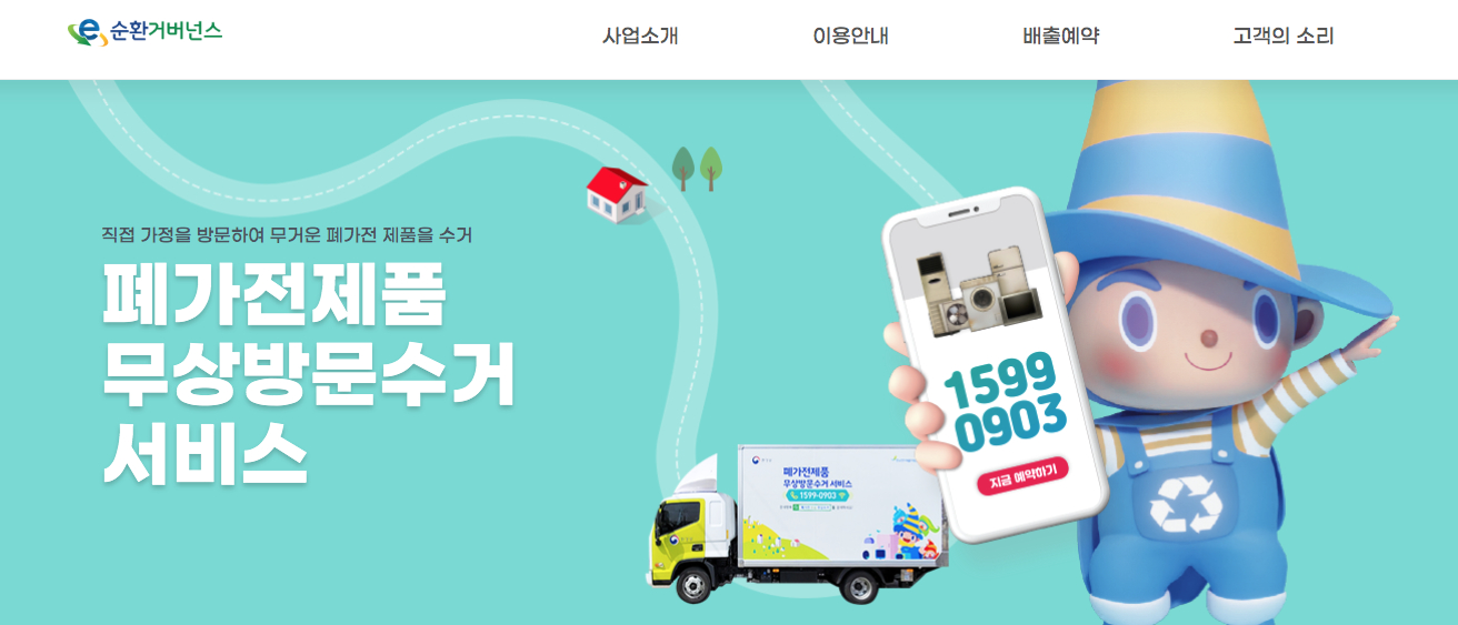 이곳에서 폐기물의 정보와 장소 및 시간을 상세히 입력한 후 예약시간에 맞추어서 프린트한 폐기물 스티커를 부착하여 배출합니다. 폐가전제품 무상방문수거 서비스 ‘순환거버넌스’도 있으니 아래를 통해 확인히시기 바랍니다.