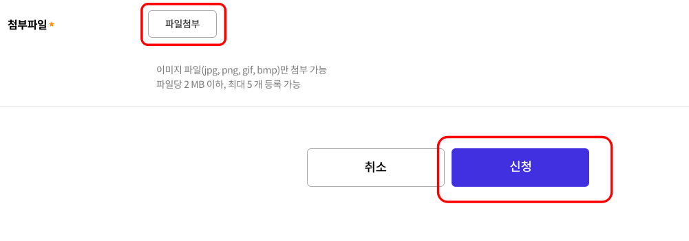 문의정보 화면에서는 문의유형, 제목, 내용을 순서대로 입력하시고 파일이 있는 경우 첨부파일에 첨부한 뒤에 하단에서 신청 버튼을 클릭합니다. 문의하신 내역은 문의내역에서 확인할 수 있으며 영업일 기준으로 1~2일 내에 답변을 받을 수 있습니다.